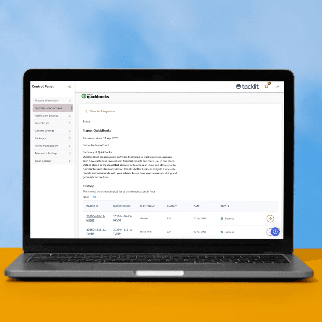 Tacklit integrates with finance software like Xero and QuickBooks, ensuring financial data flows directly from your clinical system. This eliminates manual reconciliation, reduces errors, and saves time with automated alerts and customizable dashboards.