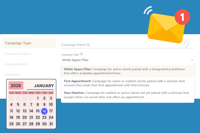 When clients are still waiting to be paired or assigned, New Match campaigns let you offer sessions using round robin auto allocation so clients book sooner and are assigned immediately. Sending a clear message with a direct appointment link removes barriers. Clients can choose the offered slot or any other available time without needing to call your service.