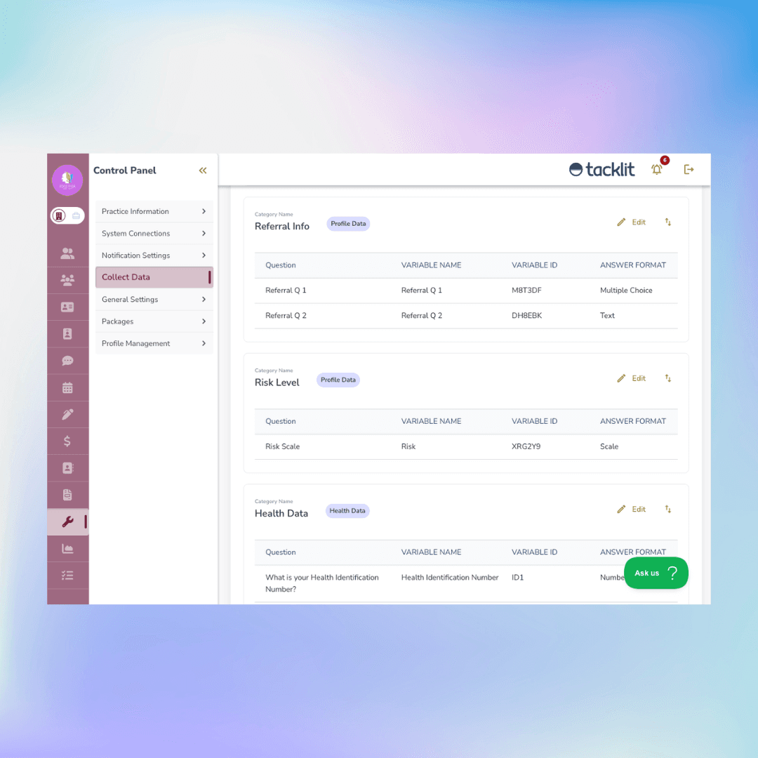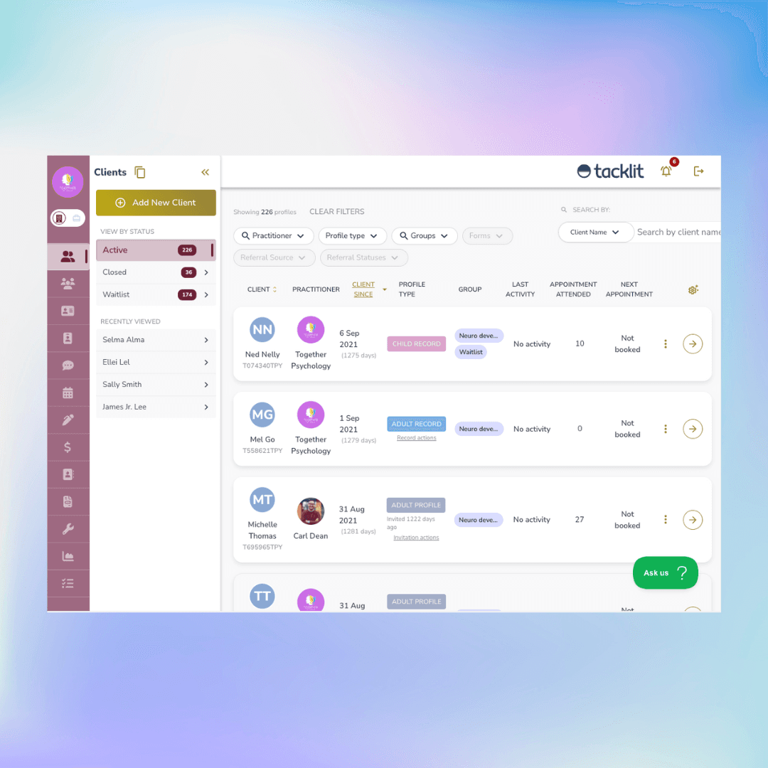 The challenges of coordinating between digital and manual entry methods can lead to inconsistencies and missed opportunities. Practices often face the risk of losing potential clients due to cumbersome registration processes that deter immediate engagement. Tacklit’s integrated solution harmonizes these methods, providing a unified workflow that captures data from multiple channels. Whether a client self-registers online or a staff member adds their information, our platform standardises the process, ensuring accuracy and continuity of care.