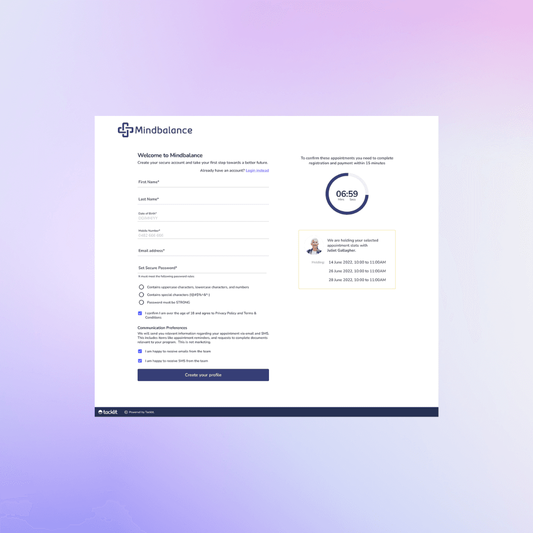 First impressions matter — and our Digital Front Door is engineered to make it exceptional. Tacklit’s mental health software offers a customisable search and matching flows that connects patients with the right practitioners through rich profiles and real-time availability.