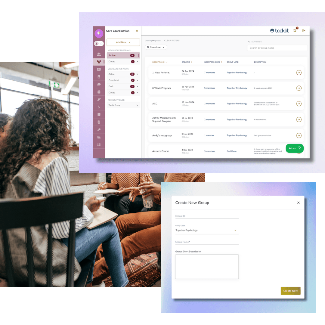 Tacklit’s Group Delivery solution enhances access to mental health care by making group sessions more affordable and dynamic. Harness the power of shared experiences to foster recovery and extend your practice’s impact—all within an integrated, secure platform.