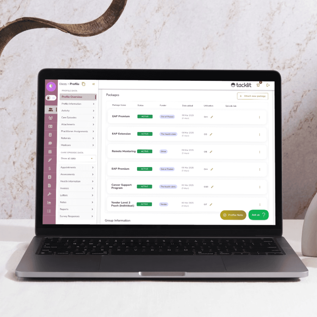 Tacklit’s Care Packages streamline bundled service delivery, prevent over-servicing, and provide actionable insights into client progress—all while ensuring compliance with funder requirements. Optimize outcomes with a solution designed to elevate both care quality and practice efficiency.