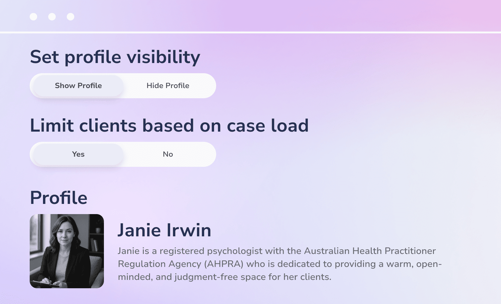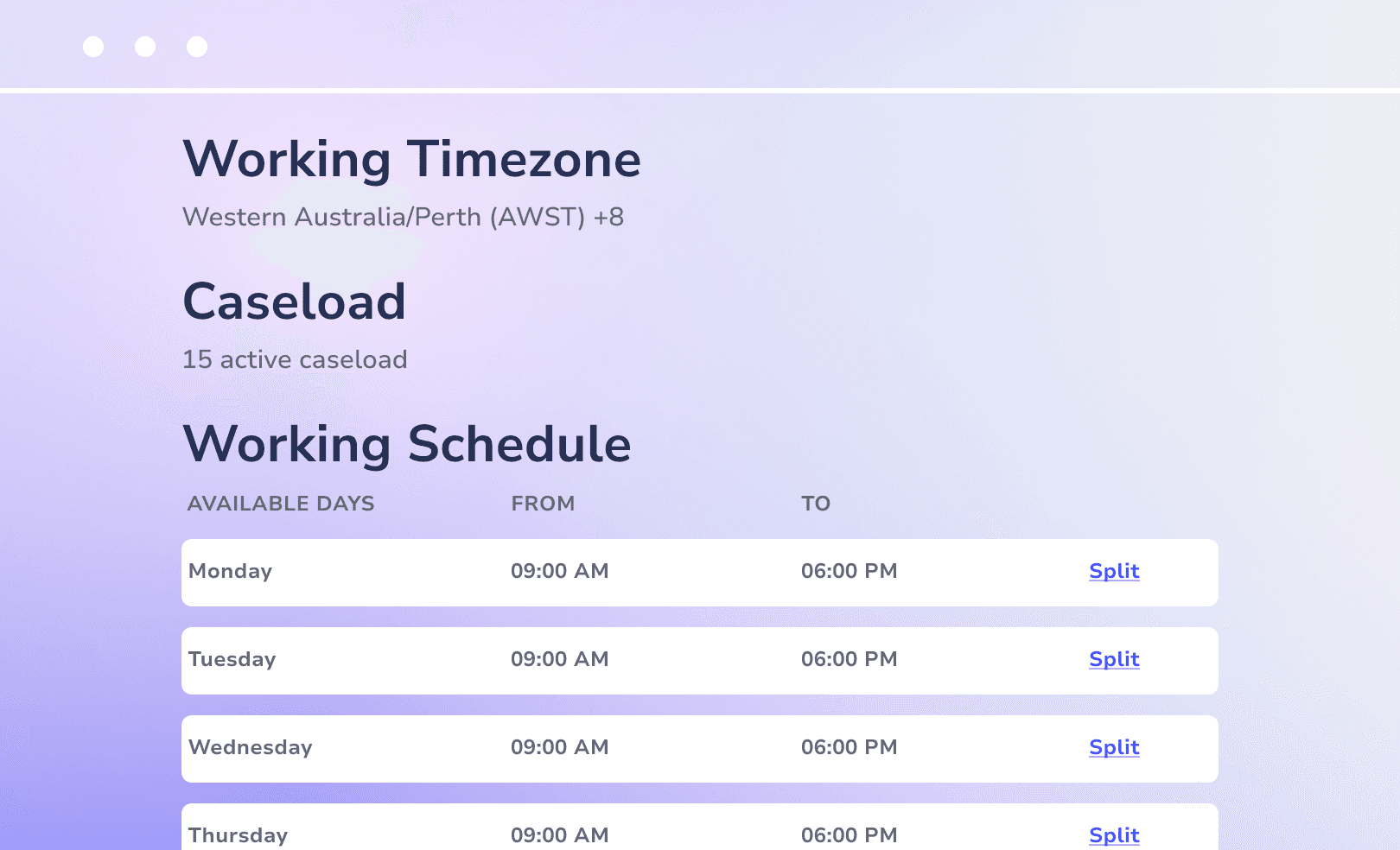 Enables you to set working schedules, manage time zones, oversee caseloads, and control service delivery, all while building rich online profiles that showcase each team member’s expertise.