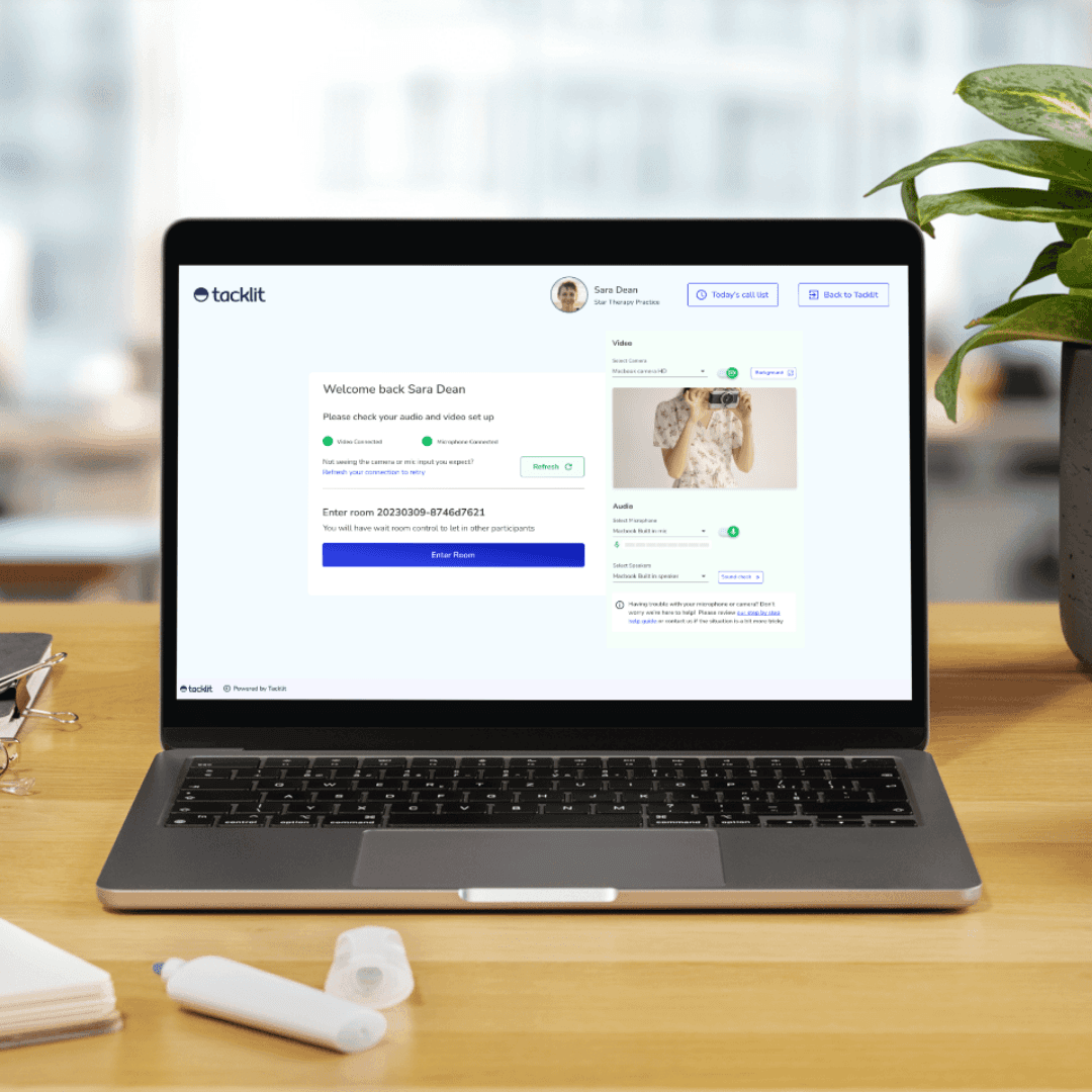 Telehealth in mental health practice management is a comprehensive virtual care system that replicates - and often enhances - the in-person experience. At Tacklit, telehealth encompasses a suite of features designed to address common challenges in remote care delivery. A secure digital waitroom provides clients with a welcoming, organised space prior to their session, mitigating confusion and delays. Self-serve troubleshooting and an optional in session Help button allow patients and staff to flag where extra help could be needed.