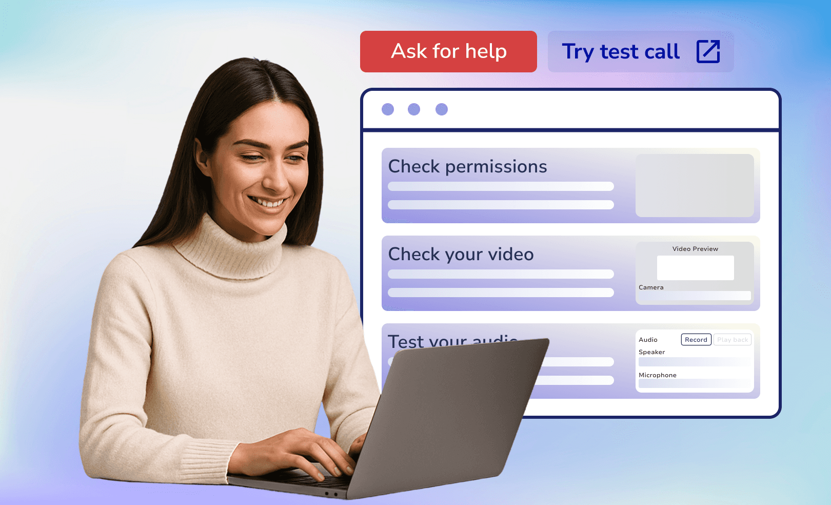 Self-serve test calls and connection walkthroughs make connecting easy. Optional Help button for clients and/or staff allow users to flag problems and allow you to respond. Using our session monitor your operations team now see, at scale, what virtual rooms are in action and react should there be DNAs or issues flagged.