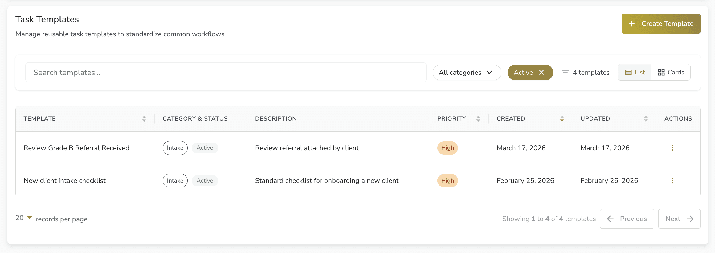 • Templates — reusable task blueprints so common tasks can be created in a few clicks with pre-filled details